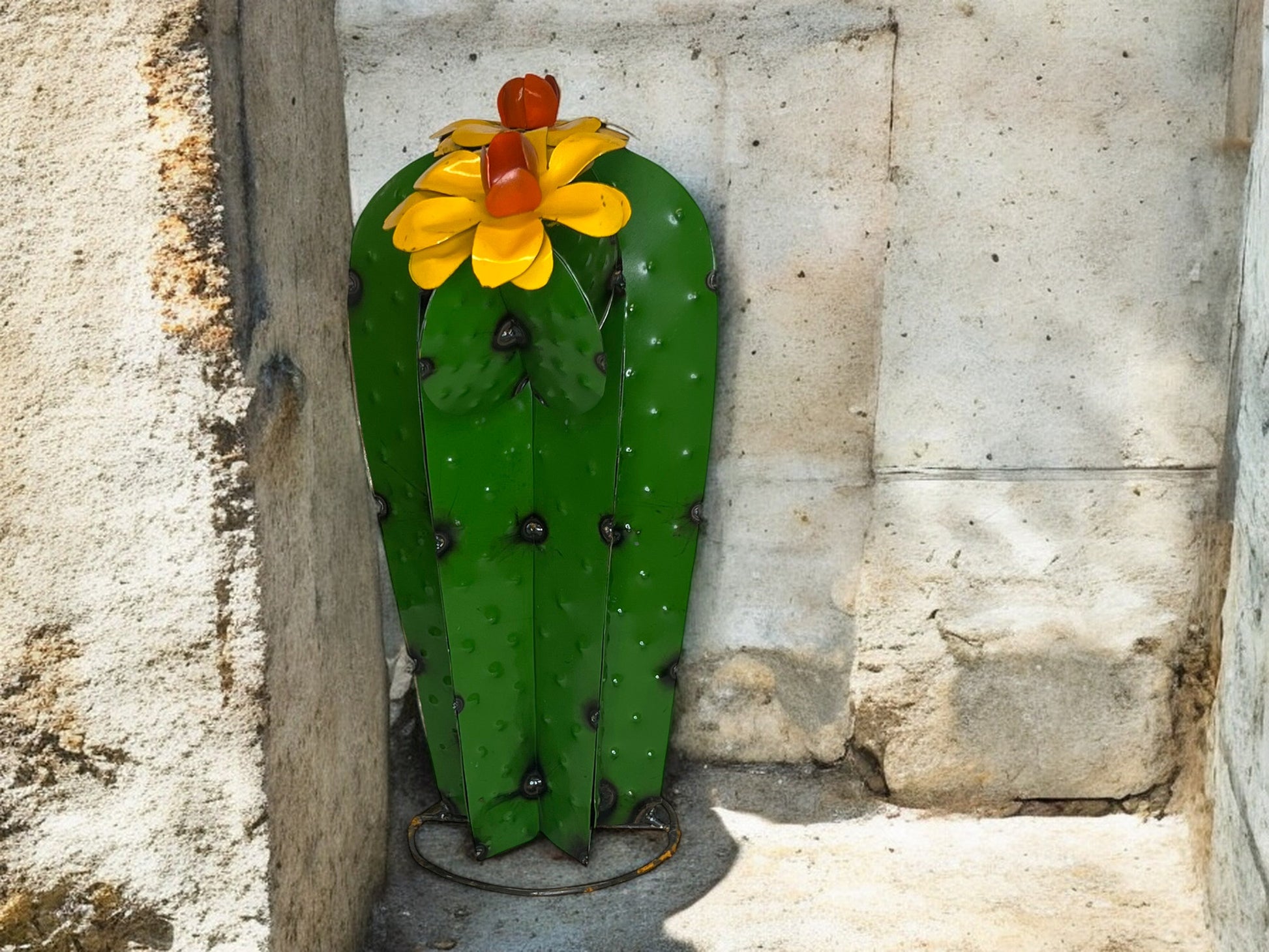 Brighten up your garden, patio, or indoor space with this charming cactus sculpture featuring three cheerful yellow flowers. This piece captures the warmth of the desert, making it an inviting addition to any plant collection or Southwestern decor. The unique yellow flowers stand out against the cactus’s natural design, adding a lively and refreshing look to any space. Dimensions: 15” H x 16” L x 7” W