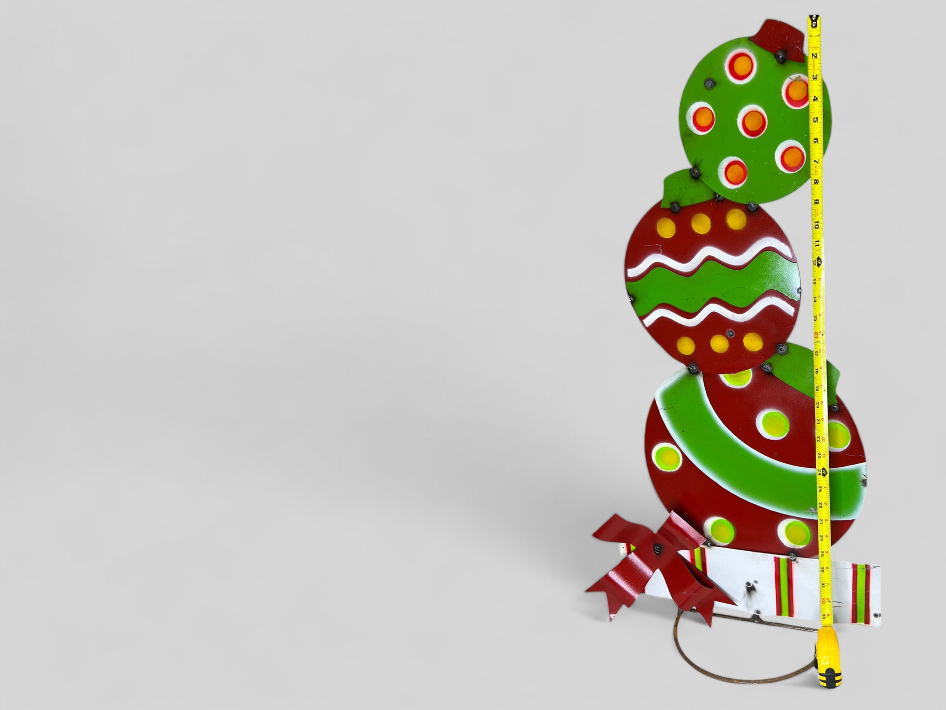 This unique Christmas tree sculpture brings festive charm with a twist! Designed with three stacked Christmas ornaments forming the tree, it features a rectangular base styled like a wrapped gift. Standing at an impressive 37 inches tall, this piece makes a delightful addition to your holiday decor, perfect for entryways, living rooms, or even as an outdoor accent. Crafted for a whimsical and cheerful look, this holiday decoration combines traditional Christmas elements with creative design, adding a joyful centerpiece to your seasonal setup. Celebrate the season with this festive ornament tree, a perfect blend of Christmas decor and artistic holiday style.