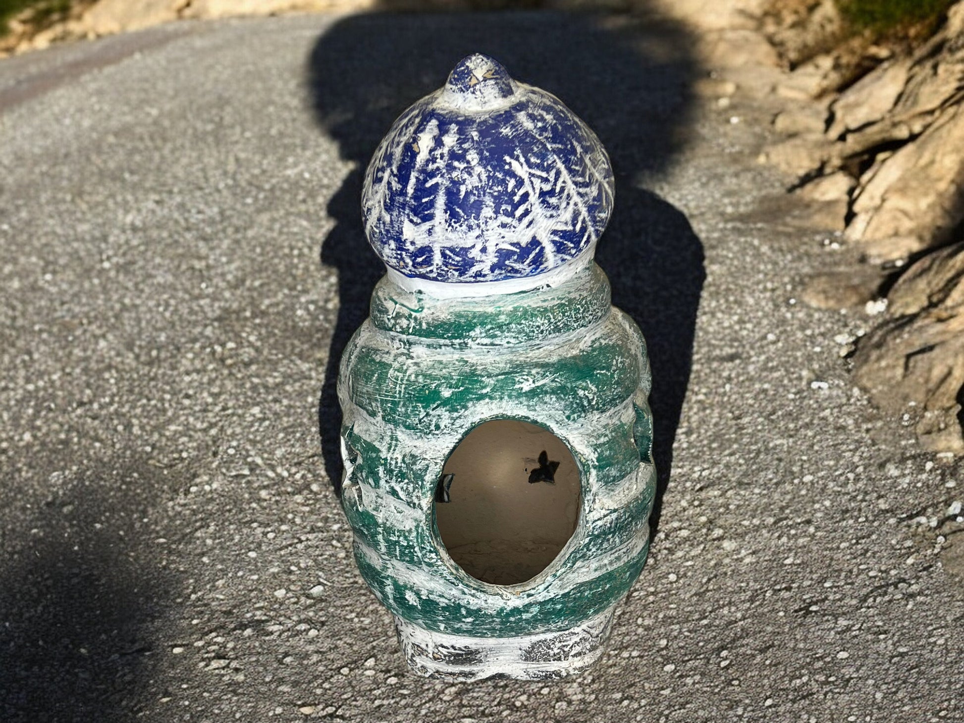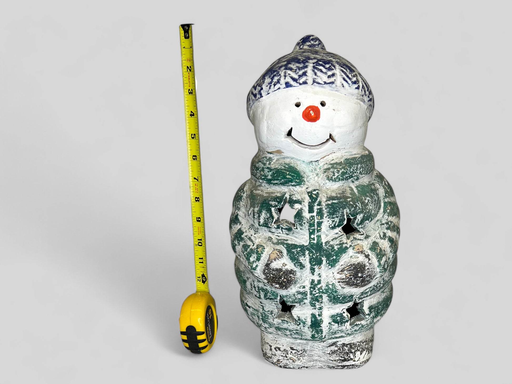 Bring seasonal joy to your home with this charming clay snowman sculpture! Dressed in a cozy green jacket and blue beanie, this snowman features a unique distressed finish, adding rustic holiday flair to any decor. The open back is designed for a light or candle, while five star-shaped openings in front cast a warm glow, making it perfect for indoor or outdoor holiday displays. This delightful holiday decoration is a wonderful addition to your winter setup or as a thoughtful gift. Celebrate the season with this whimsical snowman, sure to brighten up your holiday decor with a warm, welcoming light.