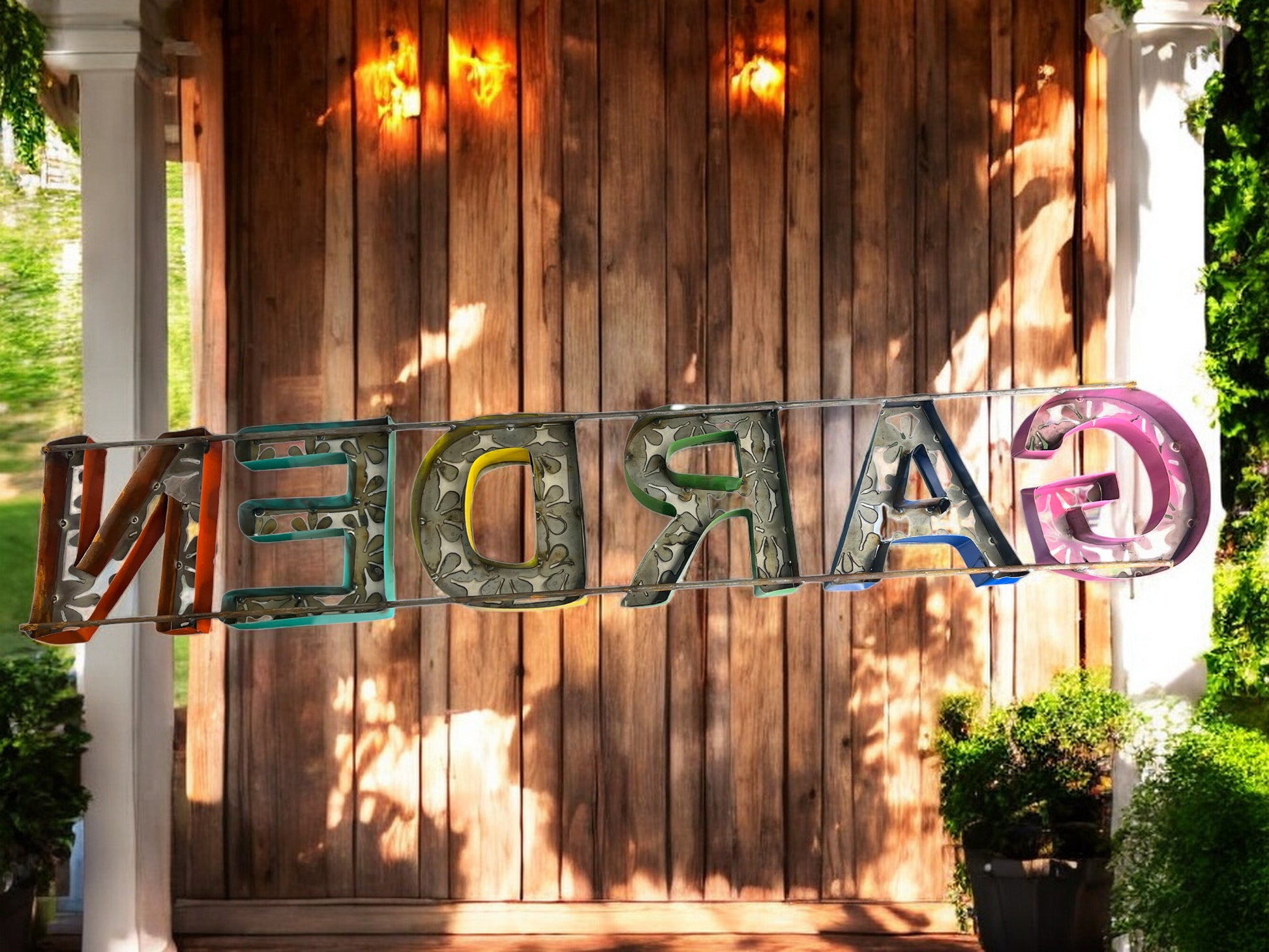 Brighten up any space with this vibrant wall sign that spells "GARDEN" in unique, open-back letters filled with charming floral designs. Each letter is painted a different color, adding a fun and lively touch to your decor. This metal sign is perfect for gardens, patios, or any outdoor area, welcoming guests with a splash of color and nature-inspired style. Durable and eye-catching, it makes a wonderful statement piece for plant lovers and gardeners alike.