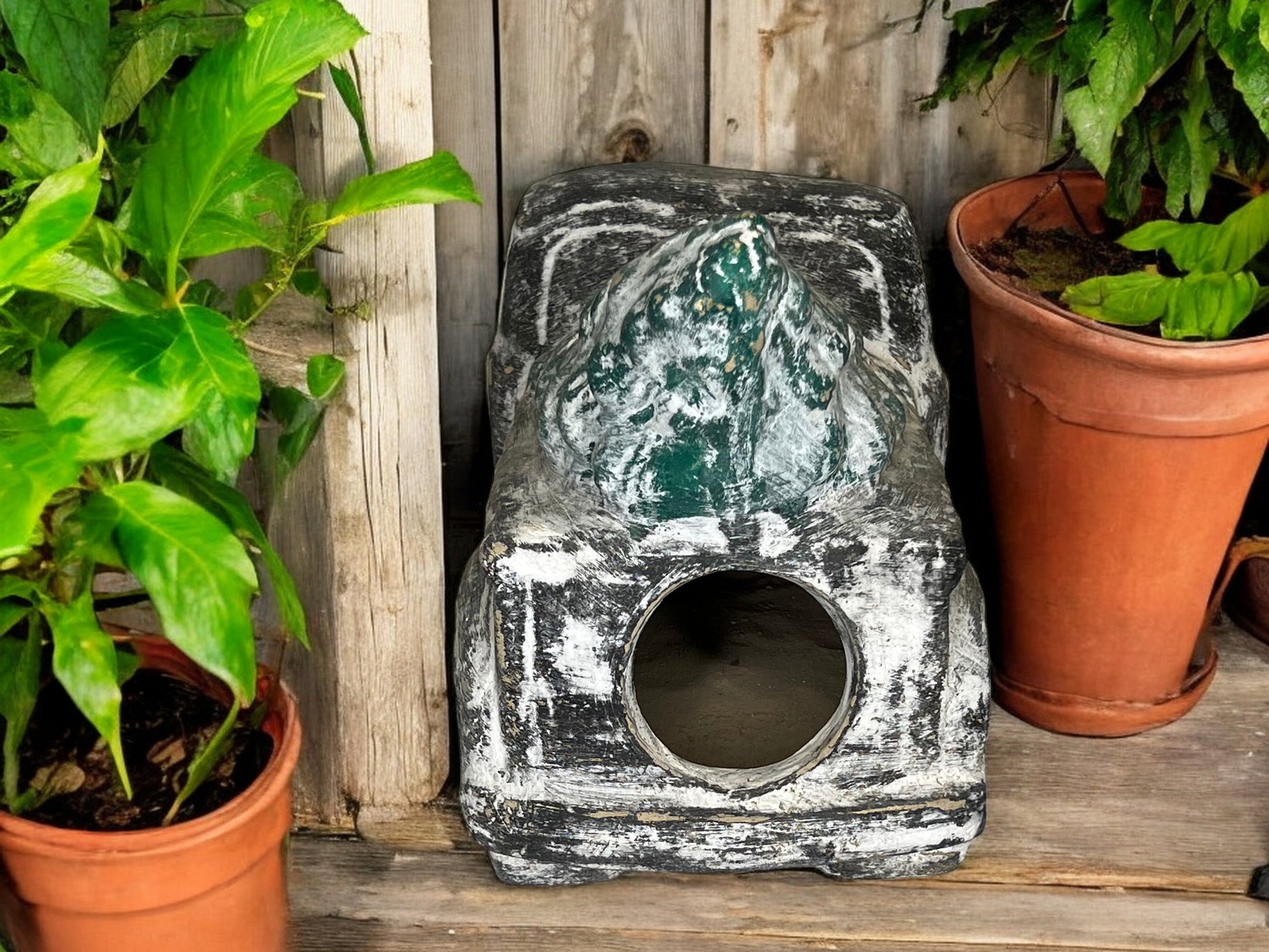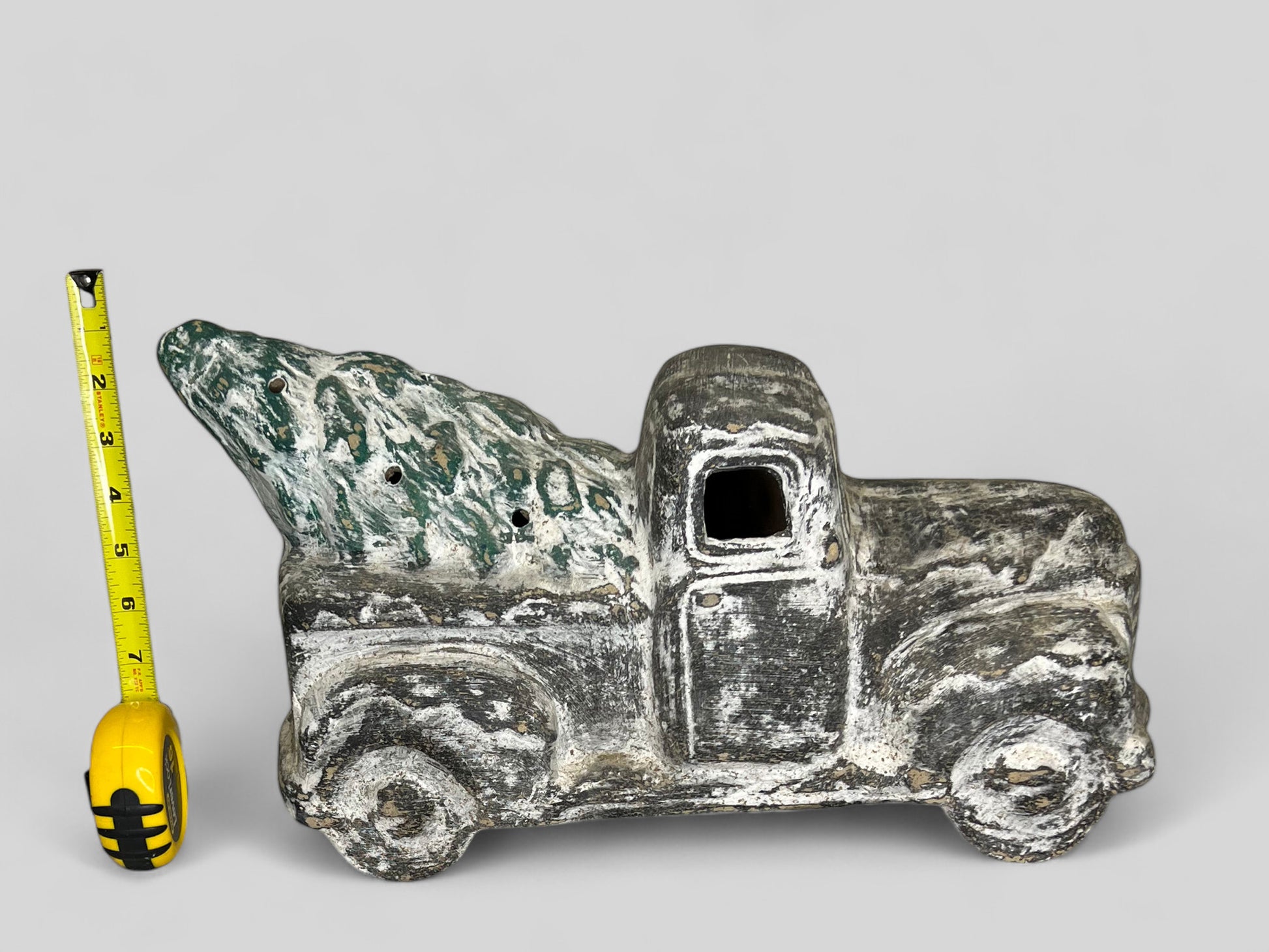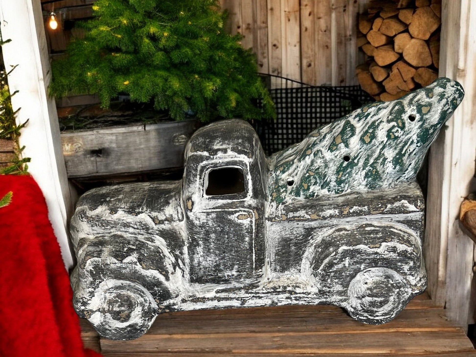 Add vintage charm to your holiday decor with this unique clay pickup truck sculpture featuring a festive Christmas tree in the truck bed! The truck has a distressed black finish that reveals subtle white details, while the green tree sports a distressed look with small openings to let light shine through. An open back allows space for a light or candle, creating a warm and welcoming glow. Perfect for any room or as an outdoor display, this nostalgic holiday decoration brings warmth and character to your seasonal decor.This charming pickup truck sculpture is perfect for those who love rustic, vintage-style holiday decor and is a unique addition to any festive display.