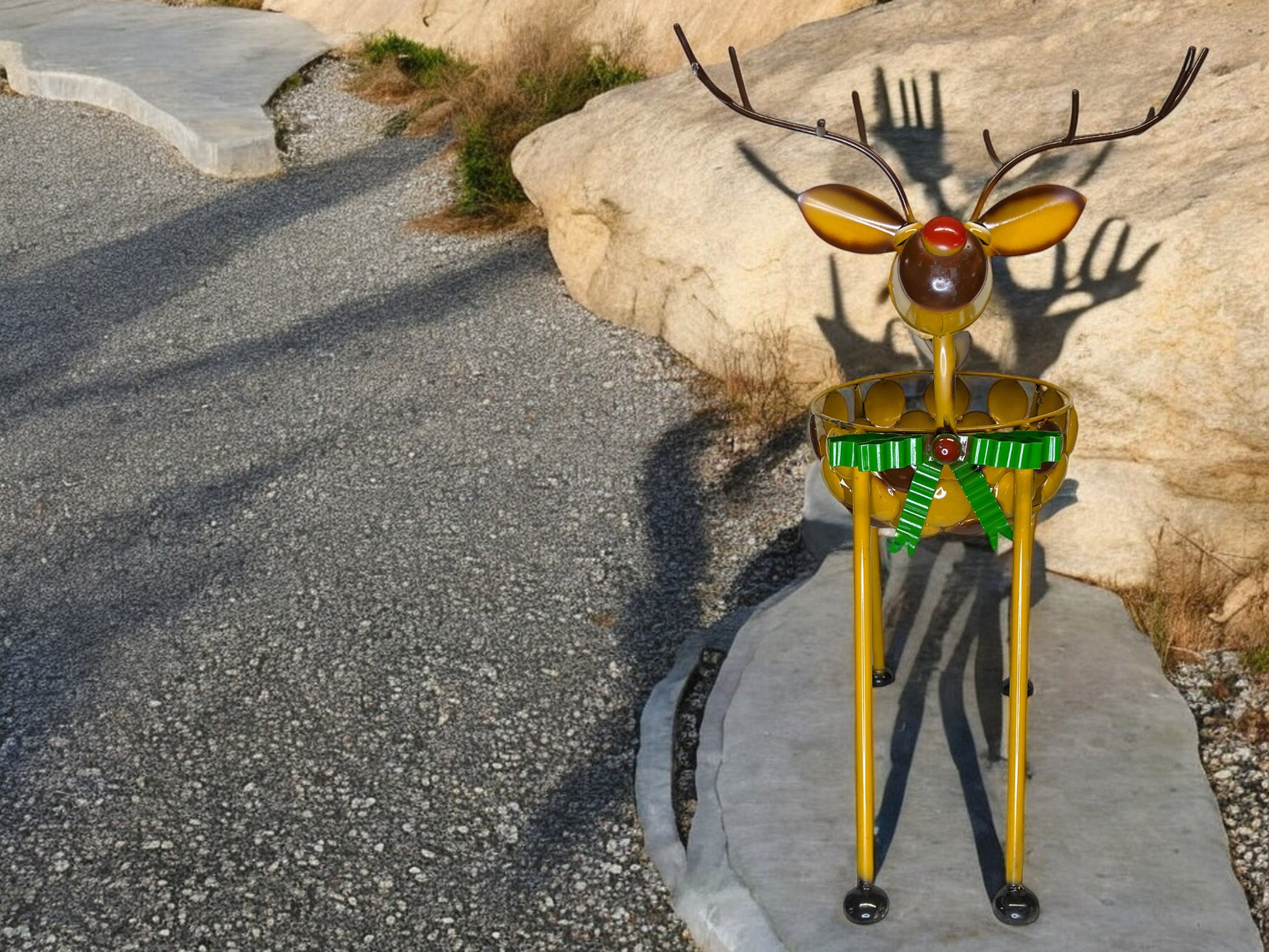 Add holiday cheer to your garden or home decor with this charming reindeer flower pot sculpture. The body is crafted from circular metal pieces creating a whimsical pot, while the metal tube legs and neck give it a unique and playful look. Featuring a red nose, just like Rudolph, a festive bow tie, and long antlers, this piece is ideal for adding holiday spirit to your indoor or outdoor spaces. Celebrate the season with this adorable reindeer, perfect for plants or holiday decor. Dimensions: Height 35 in, Length 20 in, Width 23 in