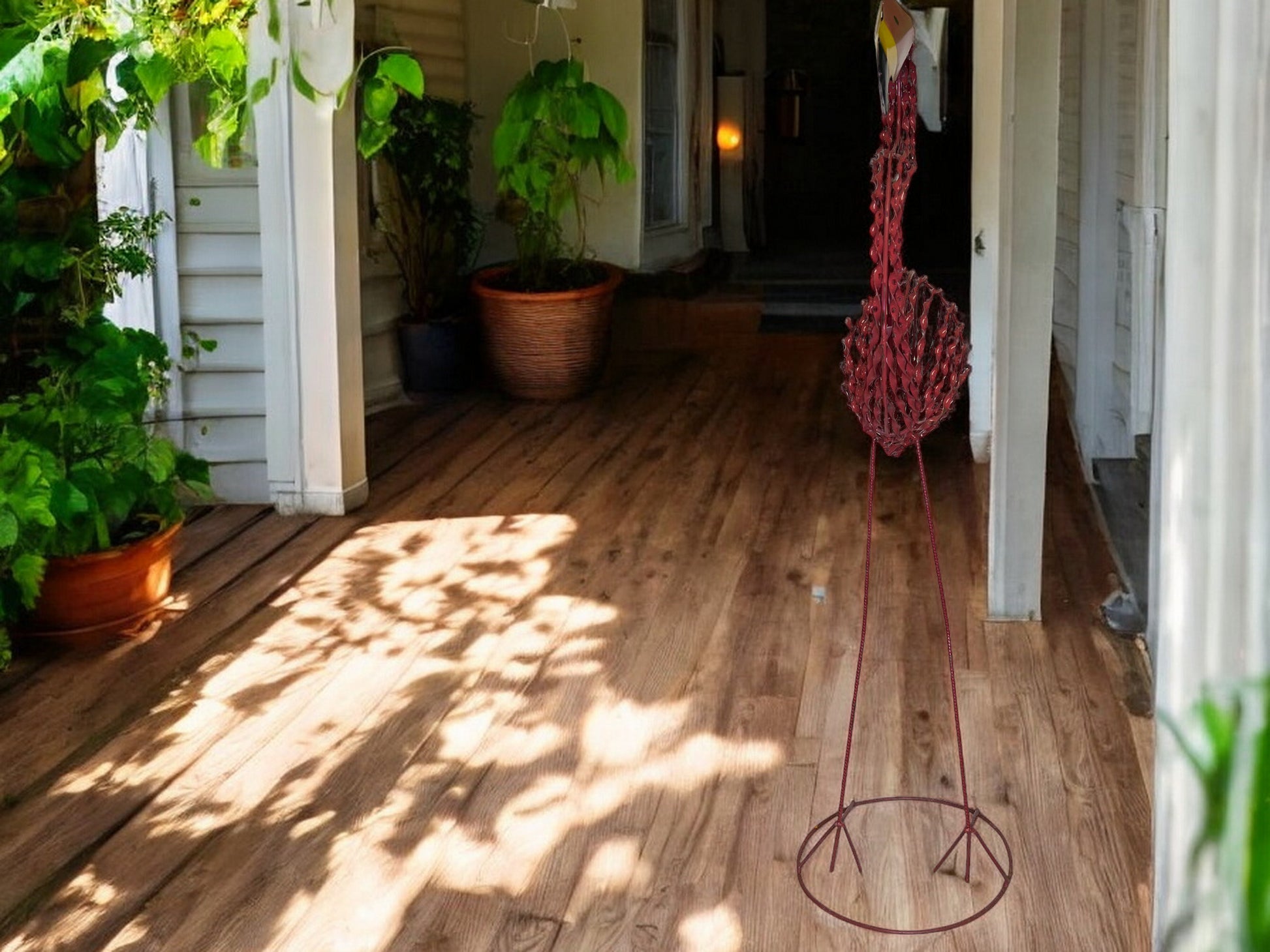 Enhance your garden, patio, or entryway with this striking metal flamingo sculpture! Designed with a slender, twisted metal body and neck and a tin metal head, this unique flamingo statue brings a touch of whimsy and elegance to any setting. It rests on a sturdy circular base, adding stability and charm to outdoor and indoor displays alike. Made from durable materials, this metal flamingo is designed to withstand the elements, making it a wonderful year-round feature. Perfect for bird lovers and anyone looking to add an artistic, nature-inspired accent to their space, this sculpture creates a stylish and eye-catching focal point. This handcrafted flamingo decor piece will make a memorable addition to your collection of garden art and nature-themed decorations.