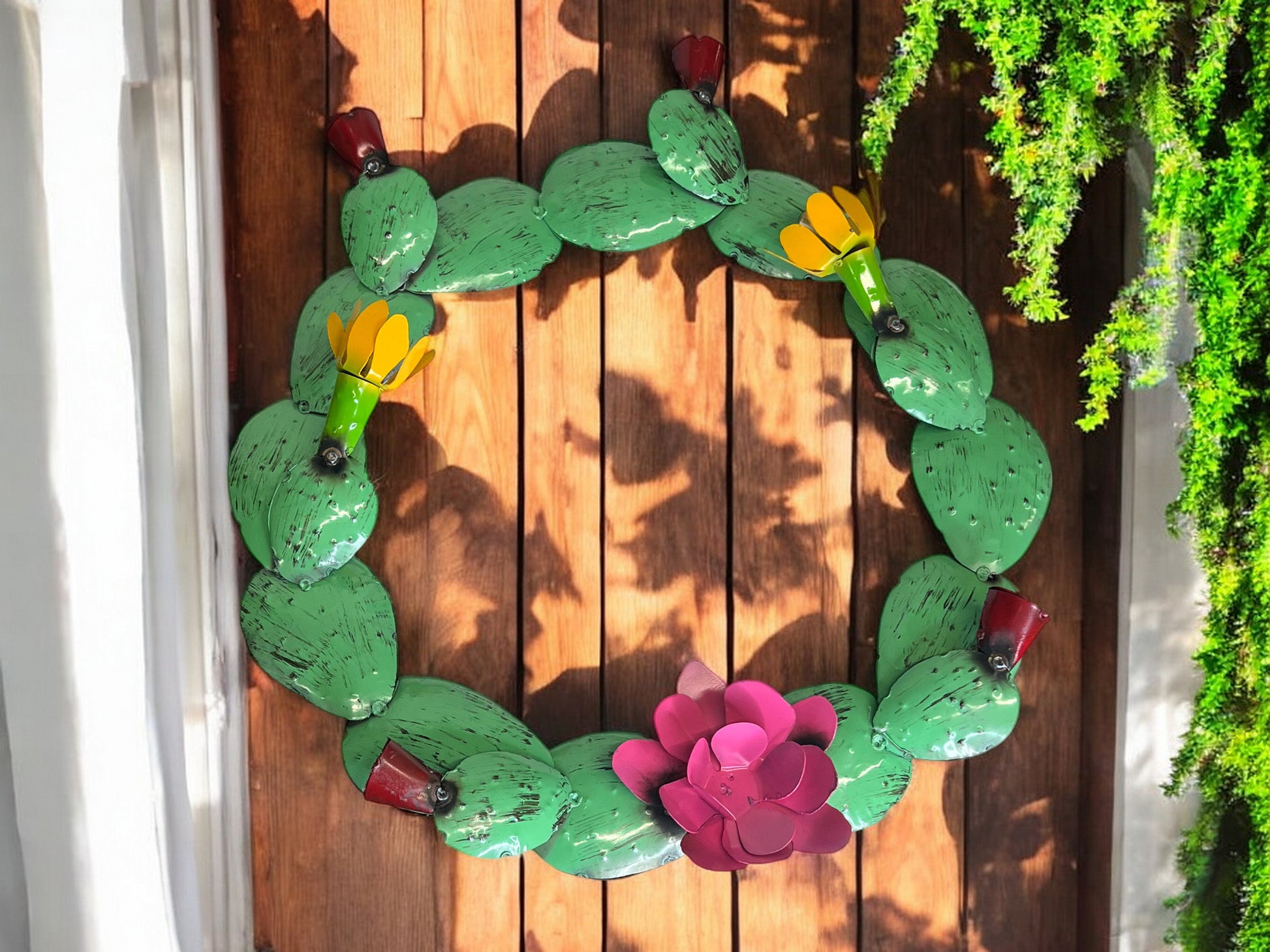 Prickly Pear Cactus Metal Wreath with Pink and Yellow Flowers