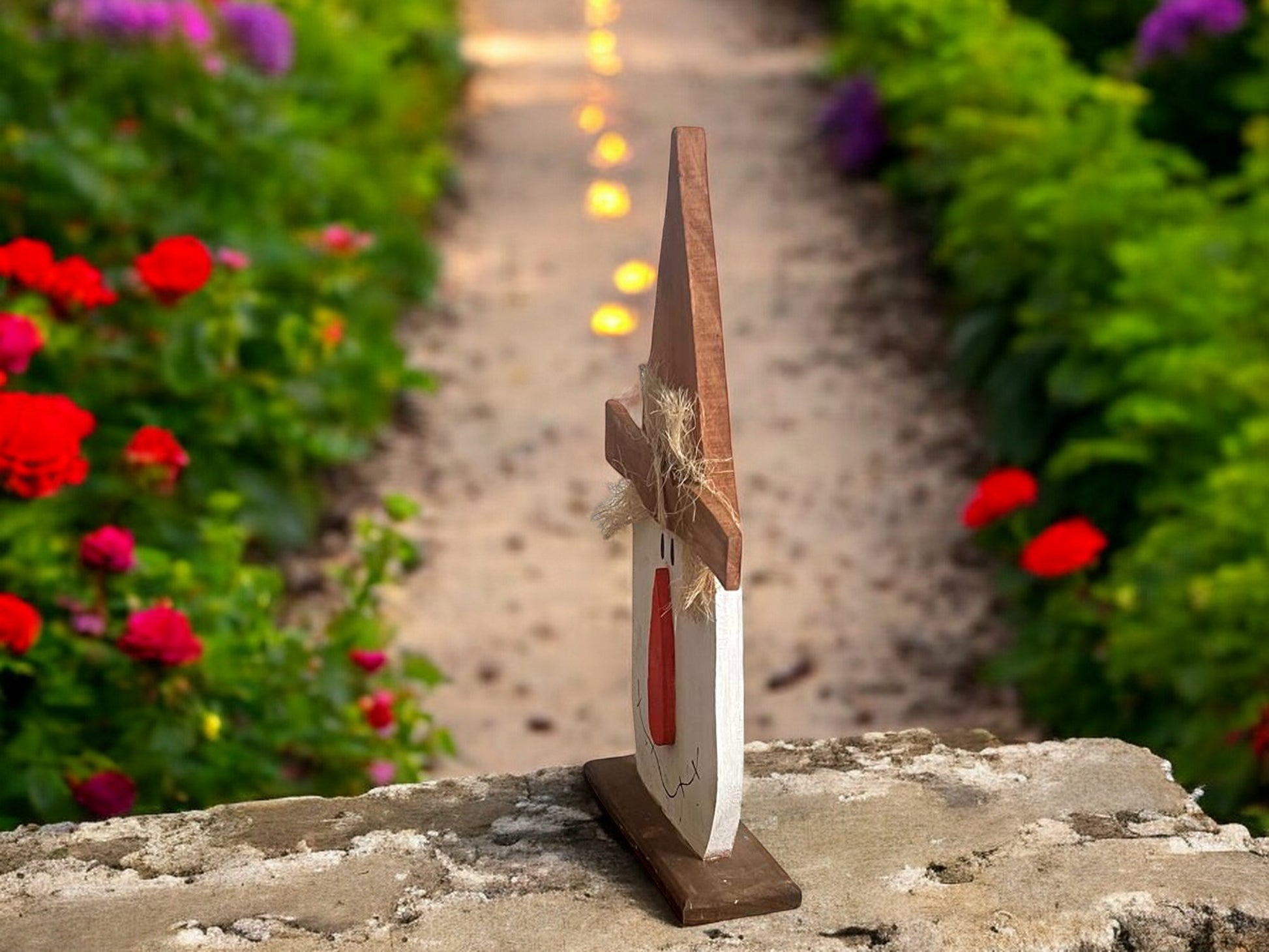 Bring a touch of farmhouse charm to your decor with this handcrafted wooden scarecrow head. Featuring a flat design with a rectangular base for easy display, the head is painted in a soft white/cream tone with a cheerful orange nose and a friendly smile. A rustic brown pointed hat adds character to this delightful piece, making it perfect for fall or year-round decor.