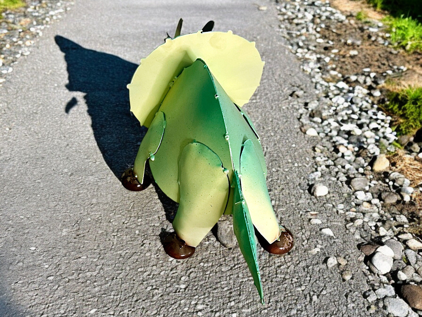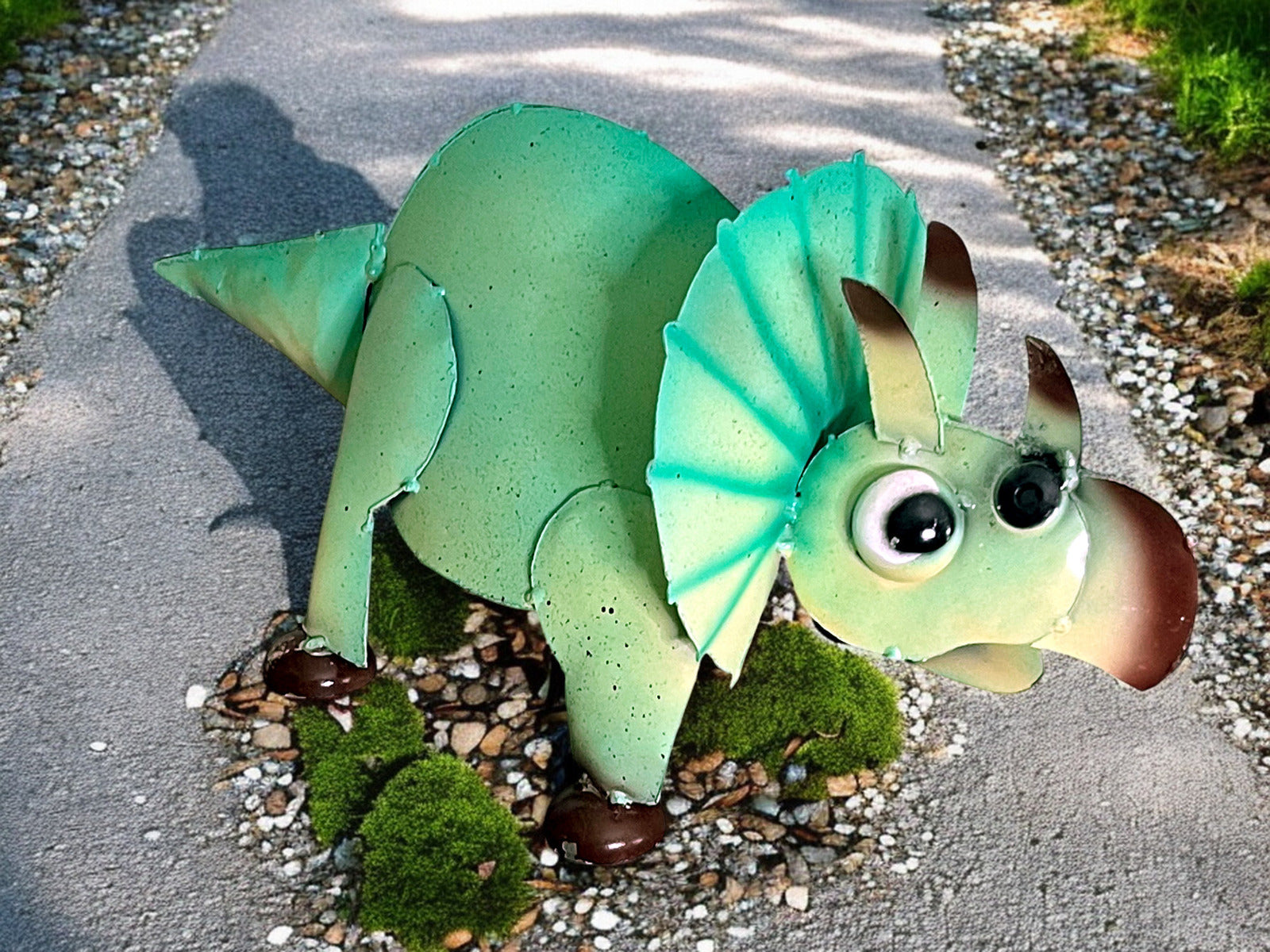Bring prehistoric charm to your decor with this captivating triceratops sculpture. Its light green body features yellow and brown accents, creating a visually appealing and playful design. Perfect for both indoor and outdoor spaces, this triceratops adds a fun and unique touch to gardens, patios, or home interiors.