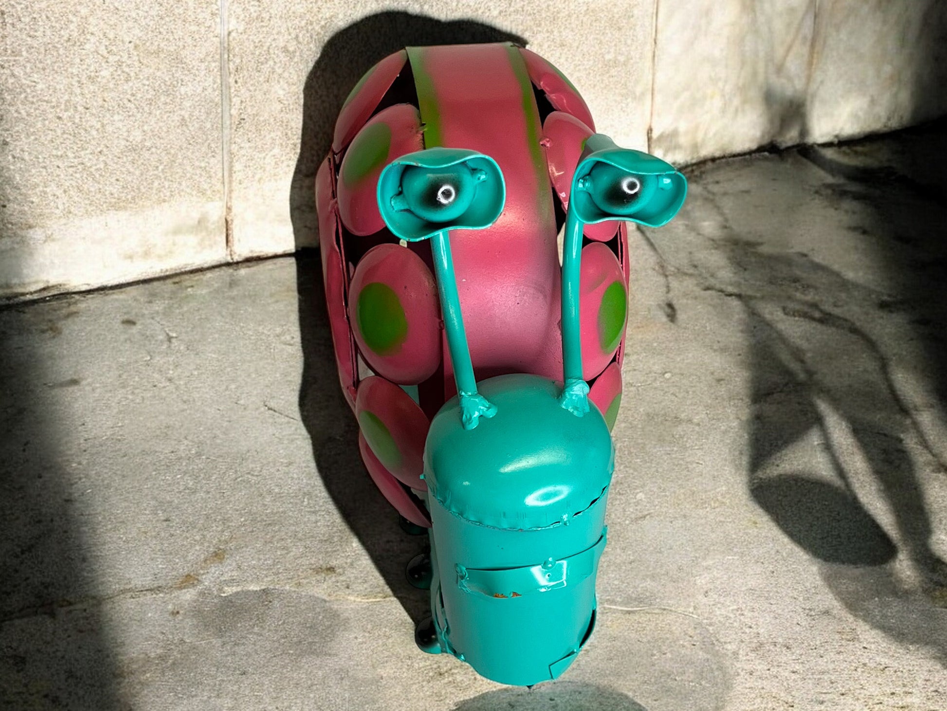 Add a splash of color and charm to your garden or home with this unique turquoise snail sculpture! Featuring a beautifully crafted pink shell with vibrant green spots, this handmade metal snail is sure to catch the eye and bring a playful vibe to any space. Perfect for indoor or outdoor display, it’s an ideal decorative piece for flower beds, patios, or tabletops, adding a touch of whimsy wherever it goes. dimensions height 15 inches length 14 inches width 6 inches